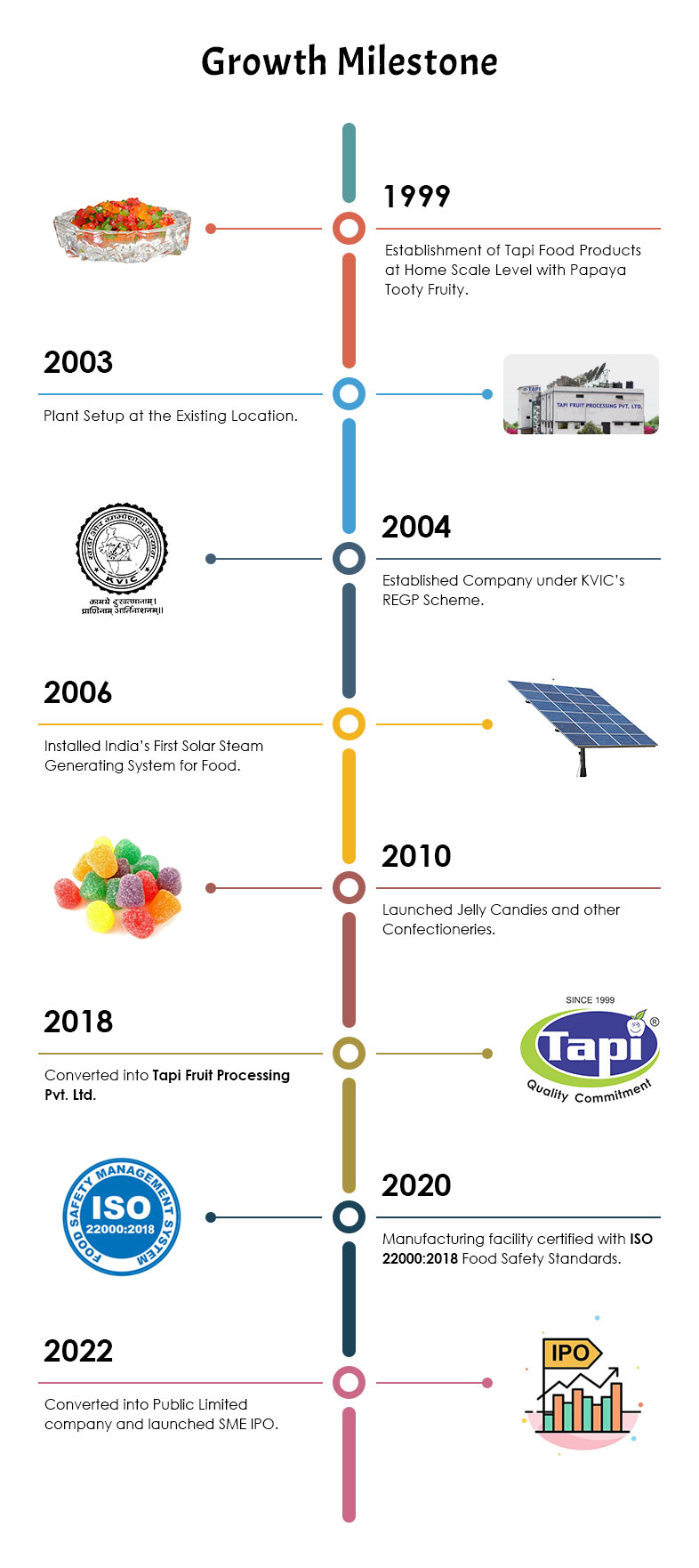 Tapi Fruit Processing Limited was earlier started as “Tapi Food Products” a home scale food processing industry in May 1999 by its Founder Director Ghanshyam Lukhi as a Proprietorship firm.